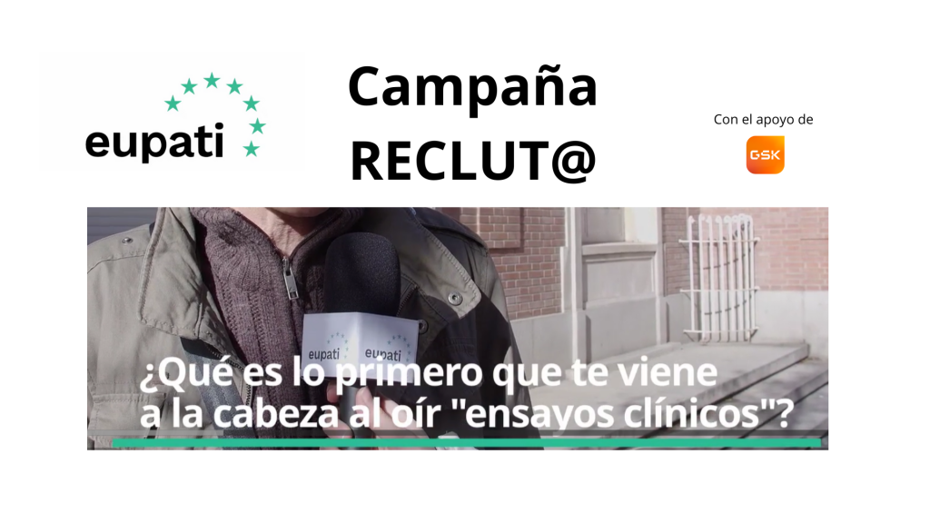 EUPATI-ESPAÑA acaba de lanzar la campaña RECLUT@, una iniciativa para dar visibilidad a la importancia de los ensayos clínicos y en la actual problemática que está habiendo en España a la hora del reclutamiento de pacientes, con el apoyo de GSK. En este sentido, se han elaborado una serie de vídeos testimoniales de pacientes y de la sociedad en general, ya disponibles en nuestro canal de Youtube y redes sociales, a través de los que poder conseguir, entre otros objetivos, los de acercar a la ciudadanía qué sabe sobre un ensayo clínico, además de si conoce en qué consiste; cómo poder participar en uno de ellos y, sobre todo, si sabe los motivos de por qué participar.